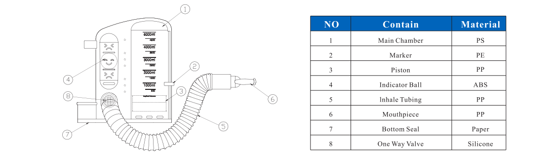 1. Abra el paquete y saque el ejercicio de respiración. Tome el tubo de inhalación con boquilla del mango, tire del tubo de inhalación hasta la longitud requerida y conecte un extremo abierto del tubo en el orificio. Deslice el marcador verde hasta el volumen (ml) prescrito por su médico.
