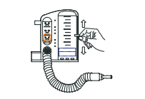 3. Inhale lenta y profundamente con el dispositivo en posición vertical, manteniendo la bola indicadora de flujo en la posición de cara sonriente. Inhale lo más profundamente posible. Cuando ya no pueda inhalar más, contenga la respiración unos segundos y compruebe hasta dónde llegó el pistón. Intente alcanzar el nivel objetivo prescrito. Repita el procedimiento el número de veces indicado. Registre su curva de progreso en la Hoja de registro del usuario.