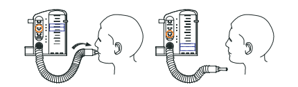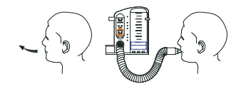 2. Justo antes de comenzar el ejercicio, exhala completamente todo el aire de tus pulmones. Coloca la boquilla en tu boca y sujétala firmemente entre tus labios para evitar que el aire se escape al inhalar.