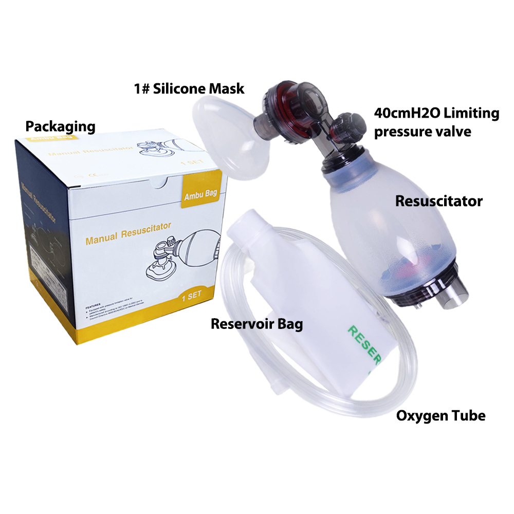 El resucitador manual está fabricado principalmente con silicona de grado médico, que ofrece una excelente flexibilidad, elasticidad y biocompatibilidad. Es suave al tacto y se ajusta perfectamente al rostro, lo que ayuda a reducir las lesiones por presión en la cara del paciente.