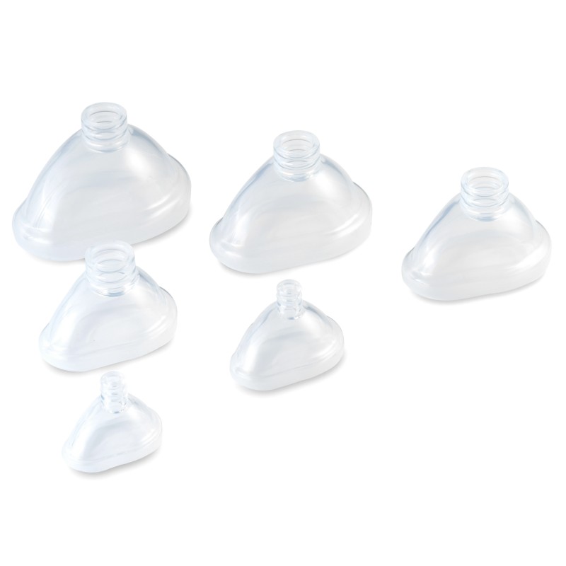 Medical reusable silicone anesthesia mask features an open cuff design, available in six sizes for general anesthesia, and is compatible with automatic ventilators and manual resuscitators. This reusable mask can be repeatedly autoclaved at 121°C, with a transparent PC shell for easy monitoring of bleeding, vomitus and spontaneous breathing. It is equipped with a soft silicone cushion for optimal facial fitting and built-in buttons for quick assembly after serialization. The mask is non-sterile, latex-free, and made with medical-grade silicone and PC materials for exceptional comfort during use.