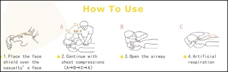 ✔Ámbito de aplicación:El protector facial para RCP está diseñado para brindar protección durante la reanimación cardiopulmonar.